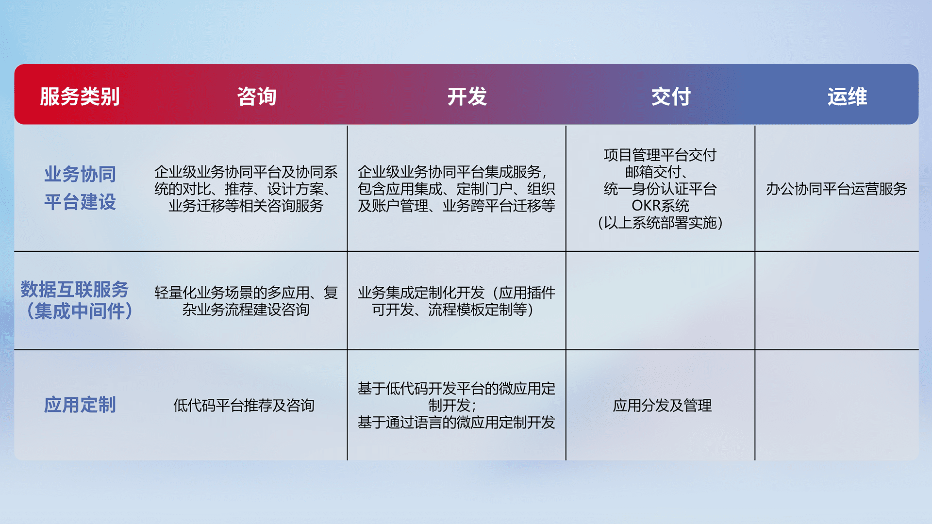 针对钉钉、、、、企微、、IDaas等平台级产品提供产品的规划、、方案、、、交付、、定制化开发等服务,,,,实现如统一协同办公、、、智能客户服务、、、、混合会议管理、、、、智能数据查询、、、、等业务场景,,,实现数字化转型。。。